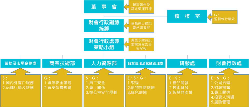 依運作實質重要性,與公司各處室職能連結,由一級主管擔任權責主管,設定各議題的目標,帶領執行同仁運作及跨單位合作,並每年定期檢討與報告實施成效及改進方向,每年至少一次向董事會報告永續發展執行成果及未來的工作計畫。